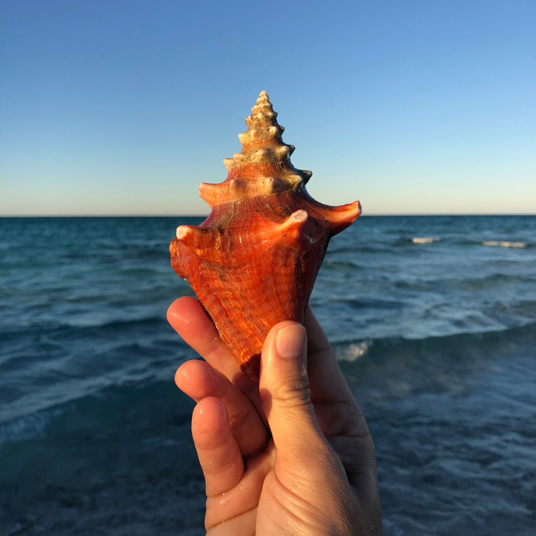Giant conch shells were scattered along the sand as I walked. Truly beautiful shells. The kind you see in beach shops that cost considerable money. They were everywhere, and varied in color — white, brown, pink, orange. The further I walked, I could see where people had collected these beautiful shells, and created several shrines along the beach with them.